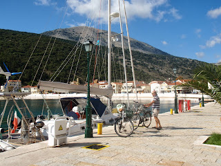 Chiamiamo con il VHF 69 per l'assistenza all'ormeggio: risposta immediata!" Pontile uno.,Ho una maglietta arancio e vi sto aspettando in cima al pontile.Mi vedete?" "Si,grazie,stiamo arrivando" Tutto OK. Siamo arrivati . Si ormeggia e dopo pochi minuti siamo già in bici in giro per Messolongi:CARIIINAA !!!!!!!!!